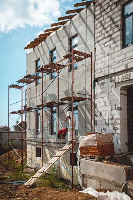 - Завершены работы по черновой штукатурке на заднем фасаде и разводке фасадного освещения.