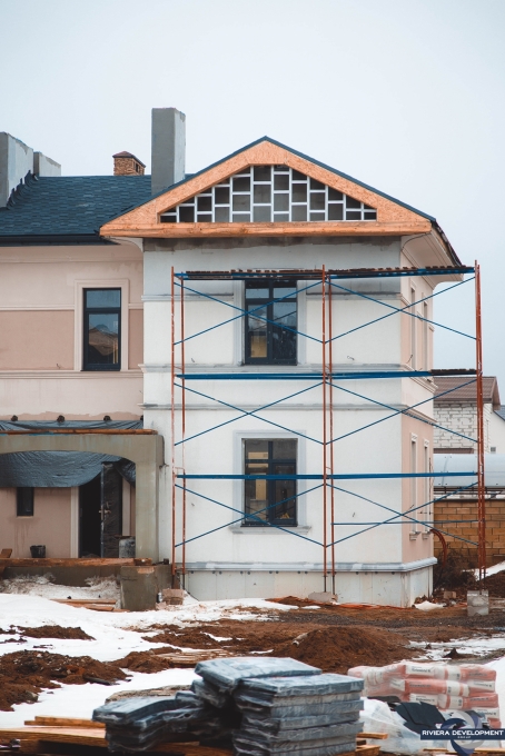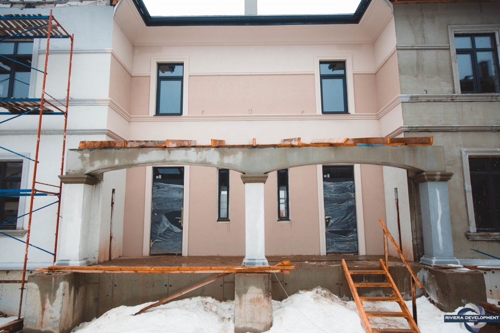 - Начаты работы по обустройству крыш над крыльцами. Смонтированы колонны и арки крылец.