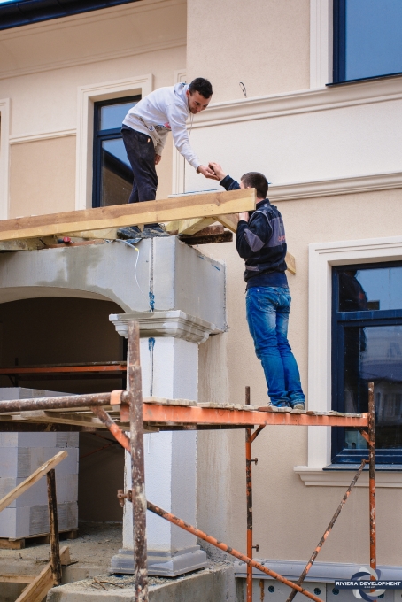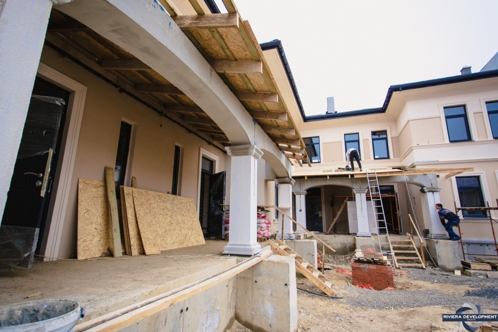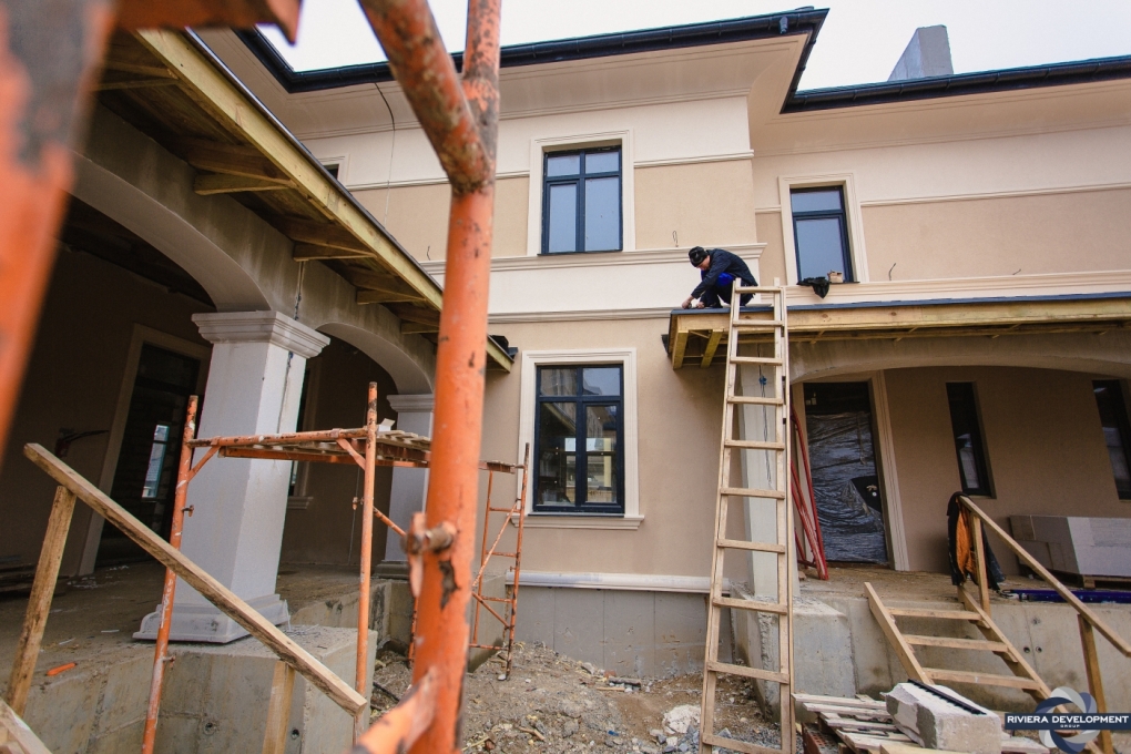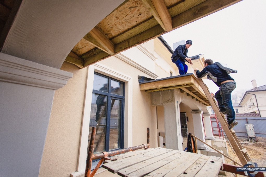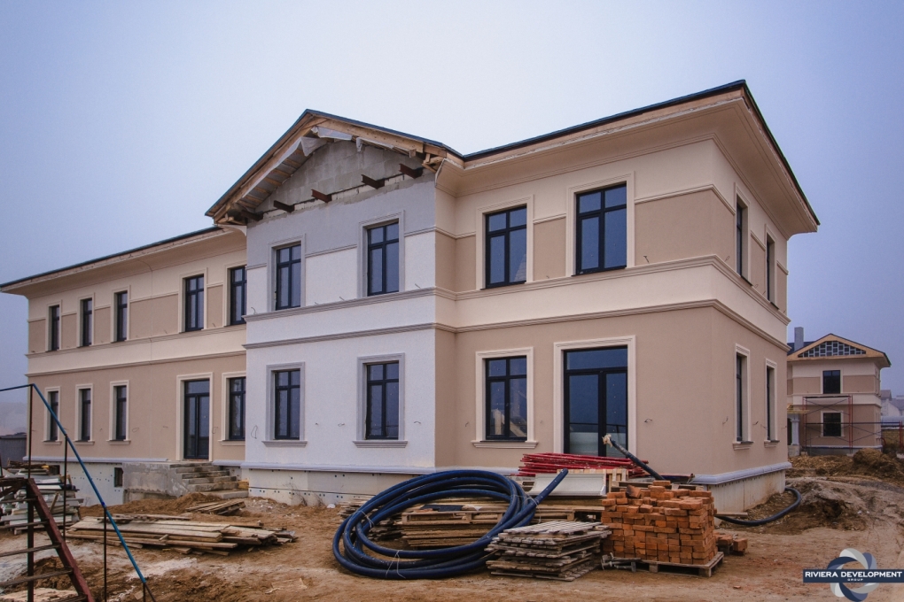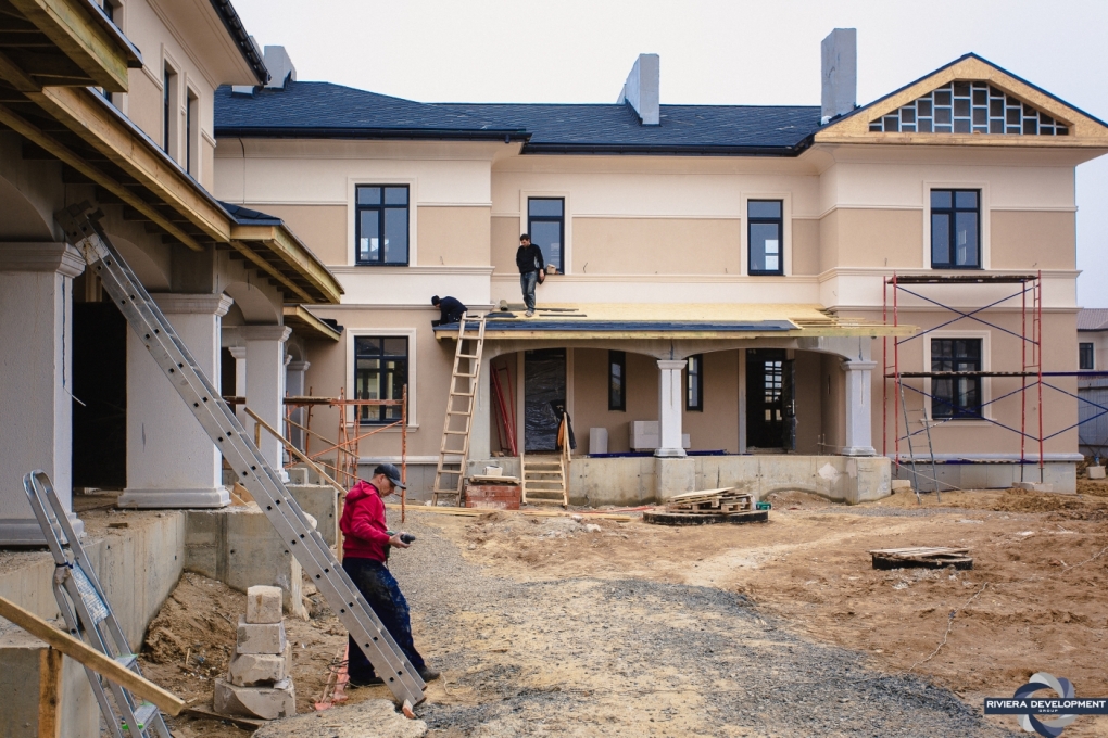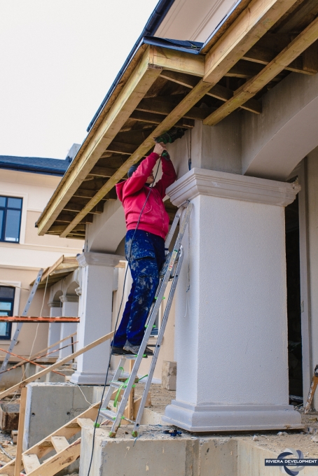 - Фасадные работы близятся к завершению: осталось выполнить финальную покраску нескольких проскостей фасада, а также колонн крылец.