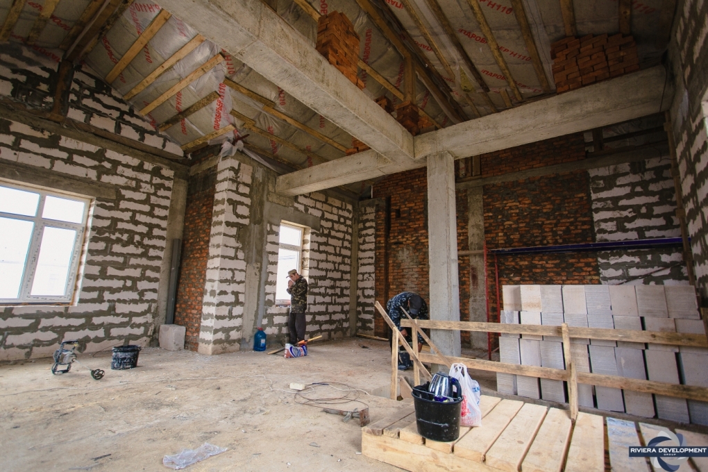 - Завершаются работы по монтажу кровли над крыльцами: 3 из 5 полностью готовы.