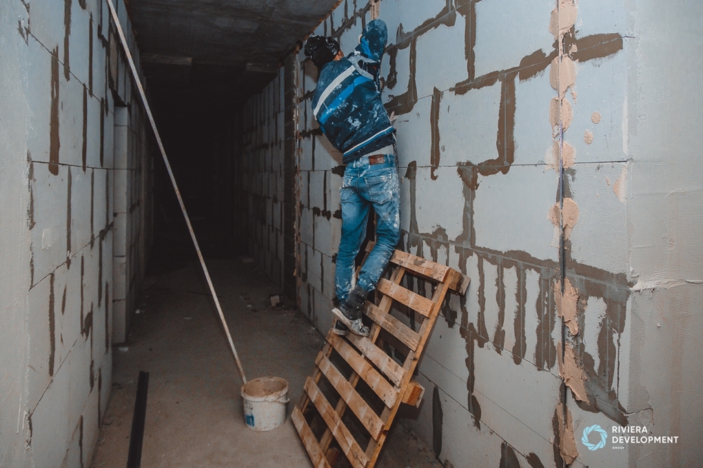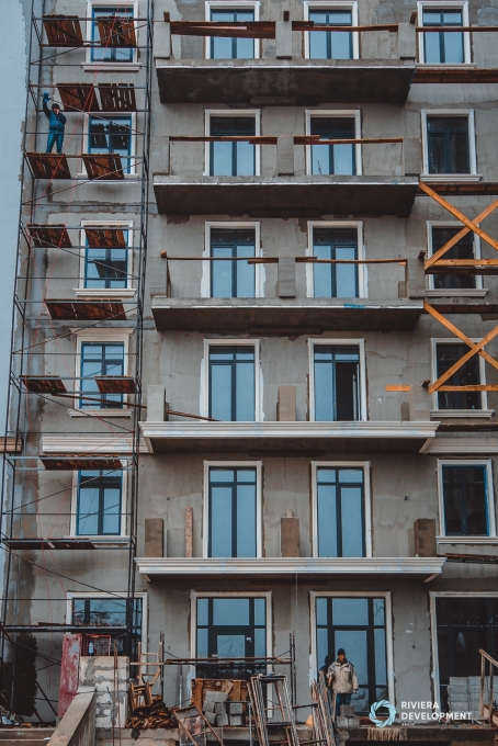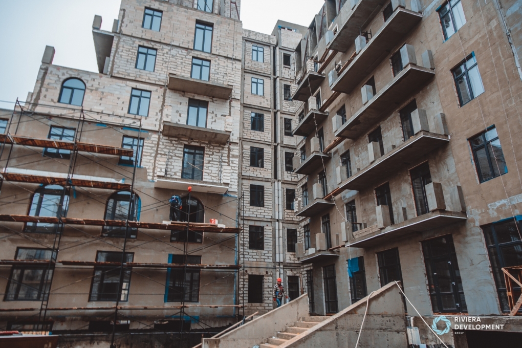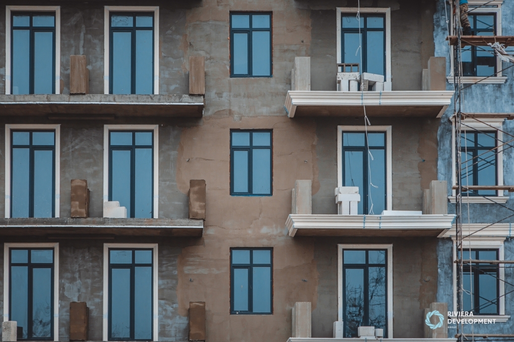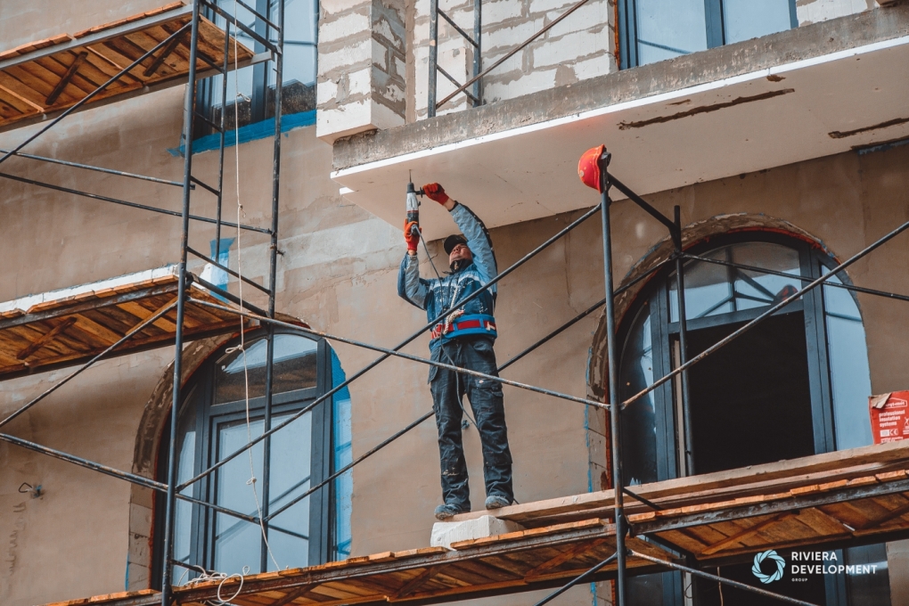 - Продолжаются работы по оштукатуриванию фасадов и монтажу декоративных элементов на фасаде.