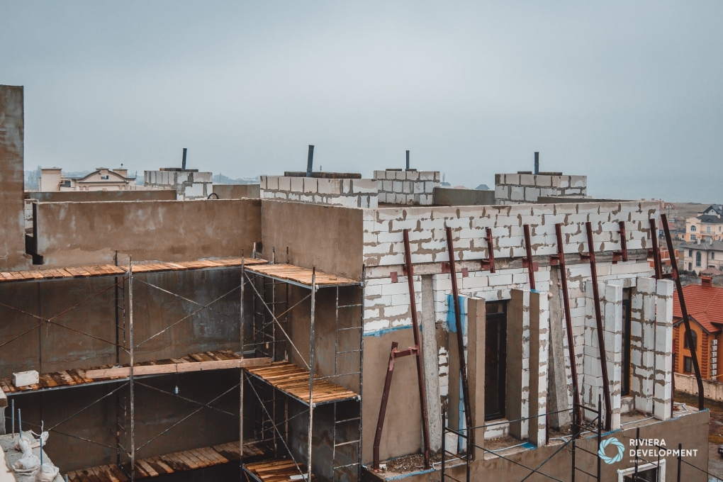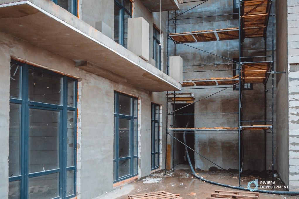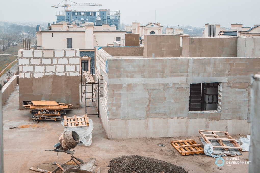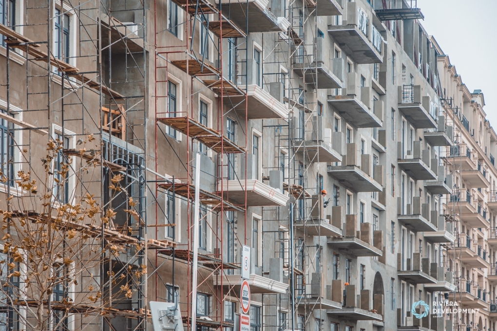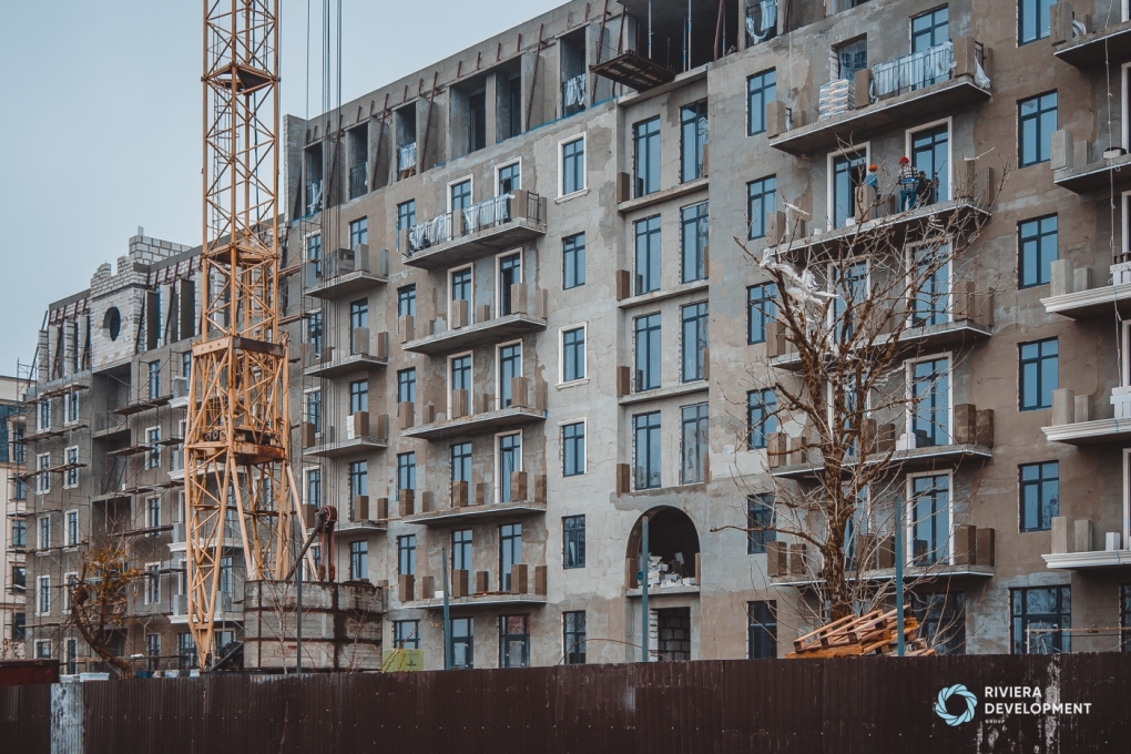 - Продолжаются работы по оштукатуриванию фасадов и монтажу декоративных элементов на фасаде.