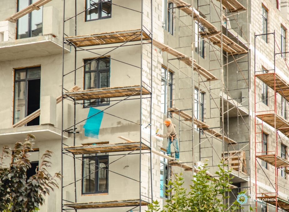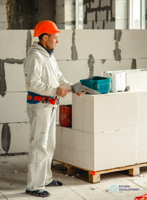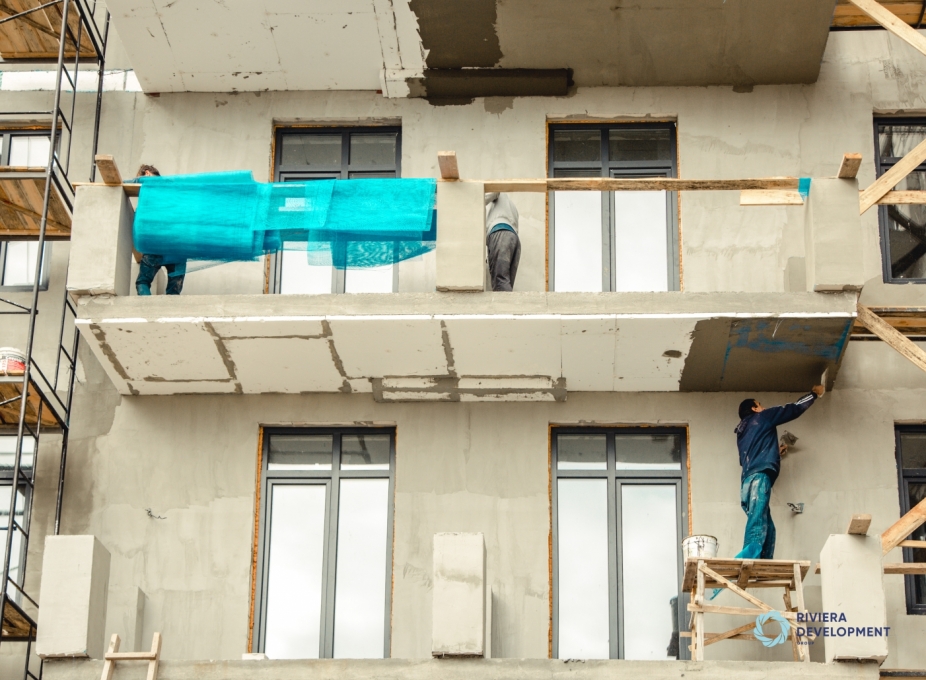 - Продолжаются работы по отделке фасадов. Работы по оштукатуриванию главного фасада выполнены на 90%. Черновые штукатурные работы на боковом фасаде со стороны 1-ой очереди ЖК «Авторский» выполнены на 50%.